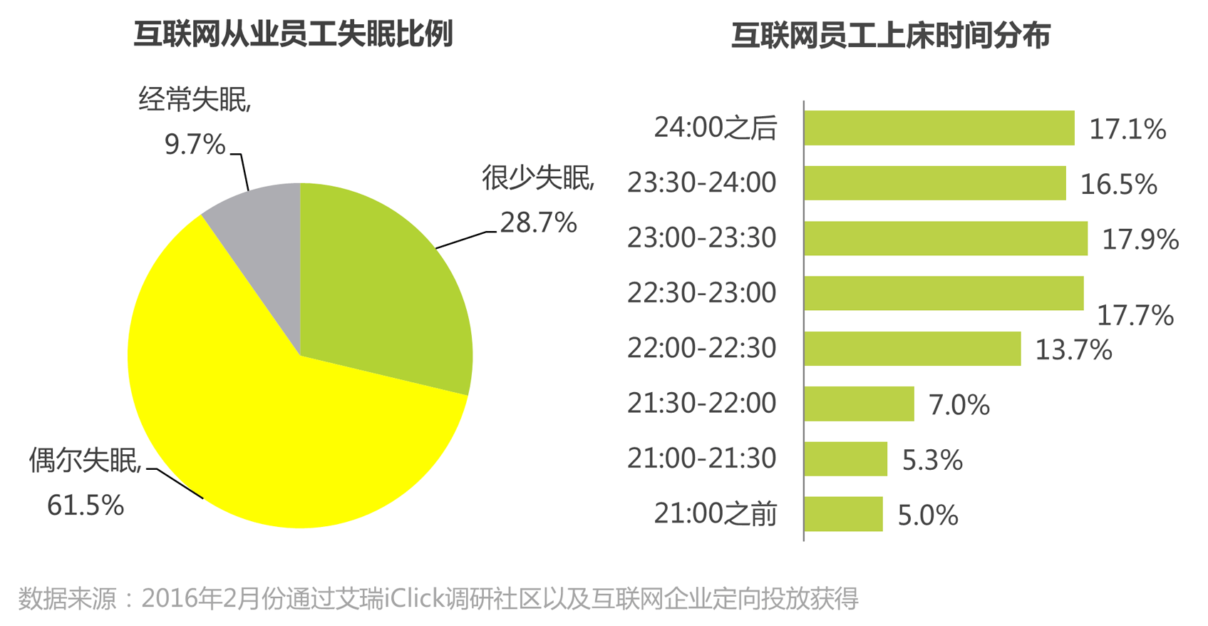 互联网人普遍存在失眠问题:71.3%的互联网人存在失眠问题,其中61.5%的人偶尔失眠,9.7%的人经常失眠。互联网人是“晚睡星人”:51.5%的互联网人晚上11点之后才上床准备睡觉,其中17.1%的凌晨12点尚未睡觉。
