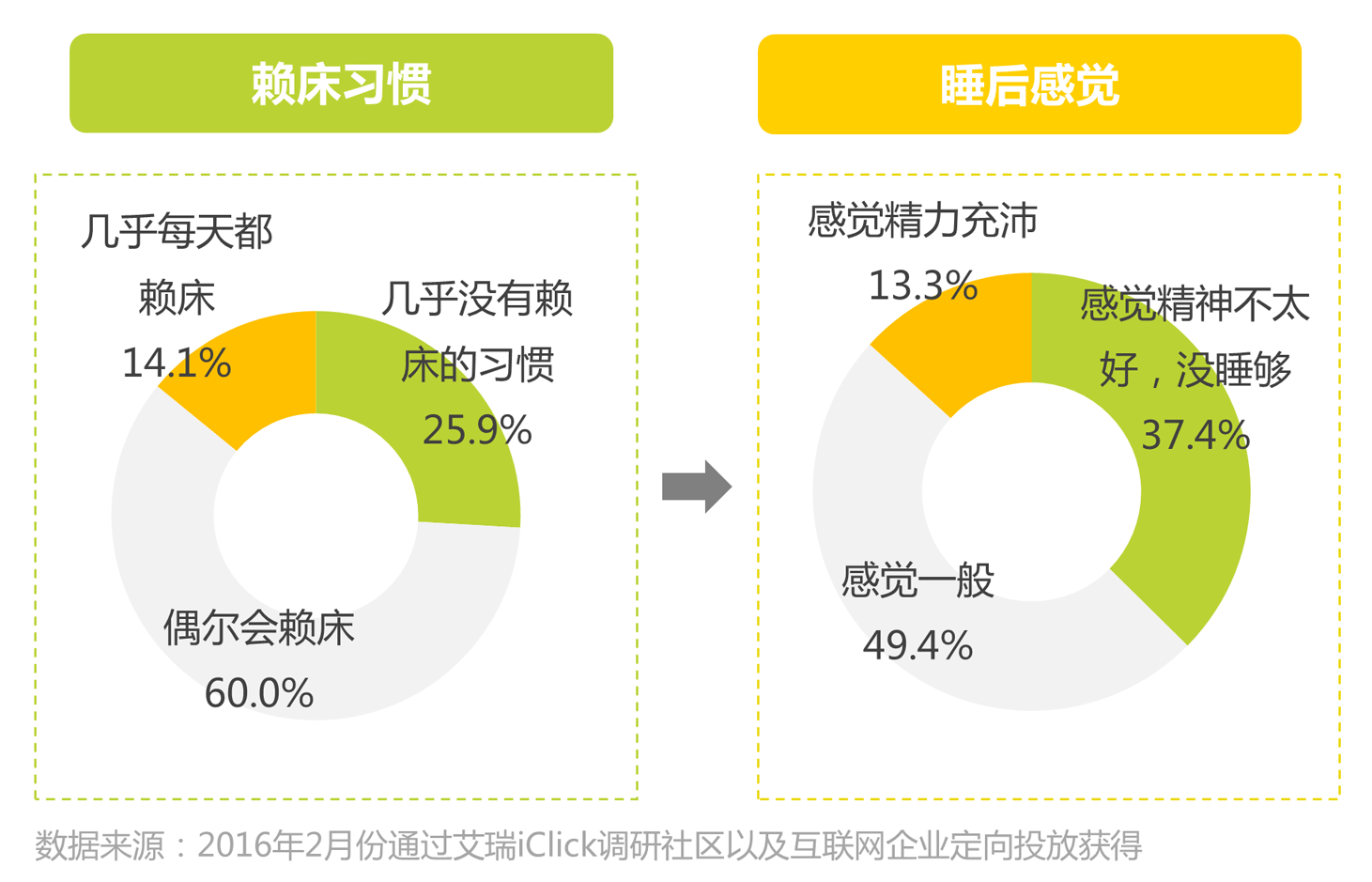 大部分员工喜欢赖床:74.1%的互联网人有赖床的习惯;14.1%的人每天都赖床。近四成员工睡后感觉不够精神:37.4%的互联网人起床后仍然觉得精神不太好,没睡够;只有13.3%的互联网员工睡后感觉精力充沛。