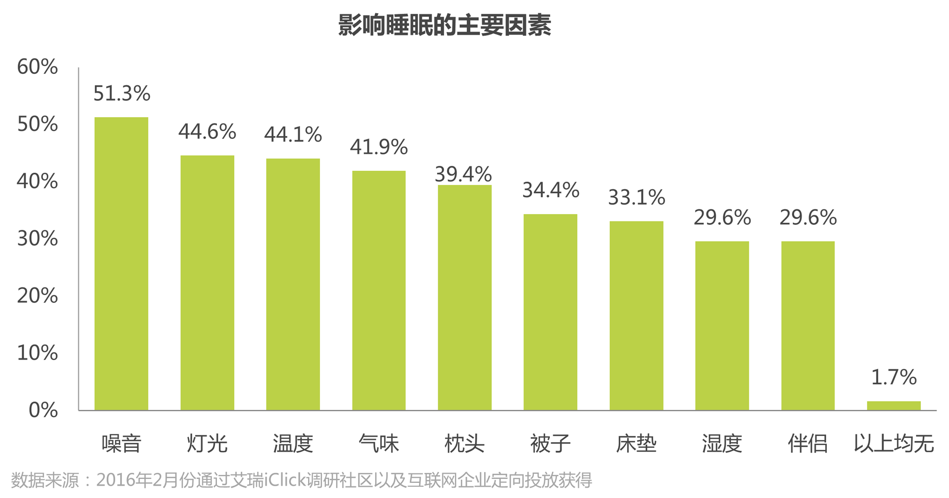 噪音是影响睡眠的最主要因素:51.3%的互联网员工认为噪音是影响睡眠的重要因素。灯光、温度、气味也是常见影响人们睡眠的主要因素:分别有44.6%、44.1%和41.9%的互联网员工认为灯光、温度、气味是影响睡眠的重要因素。