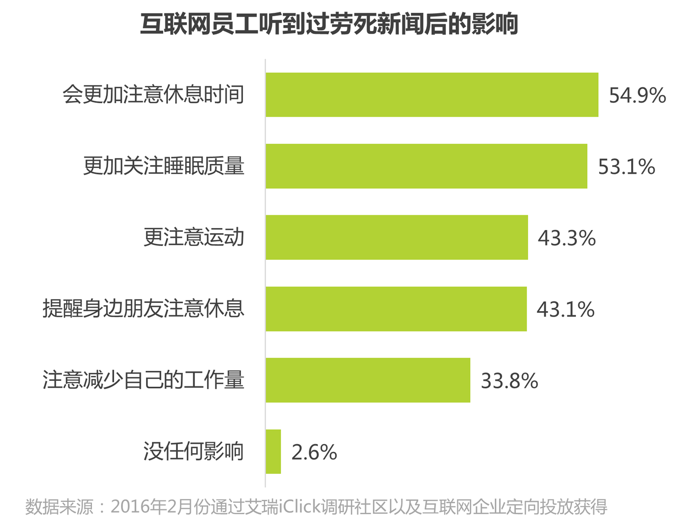 大部分互联网员工接触过劳死新闻都会受到一定影响,引起他们对于休息的重视:54.9%的人听到这类新闻后会更加重视休息时间,53.1%会更加关注睡眠质量,只有2.6%的人表示自己不会受到任何影响。