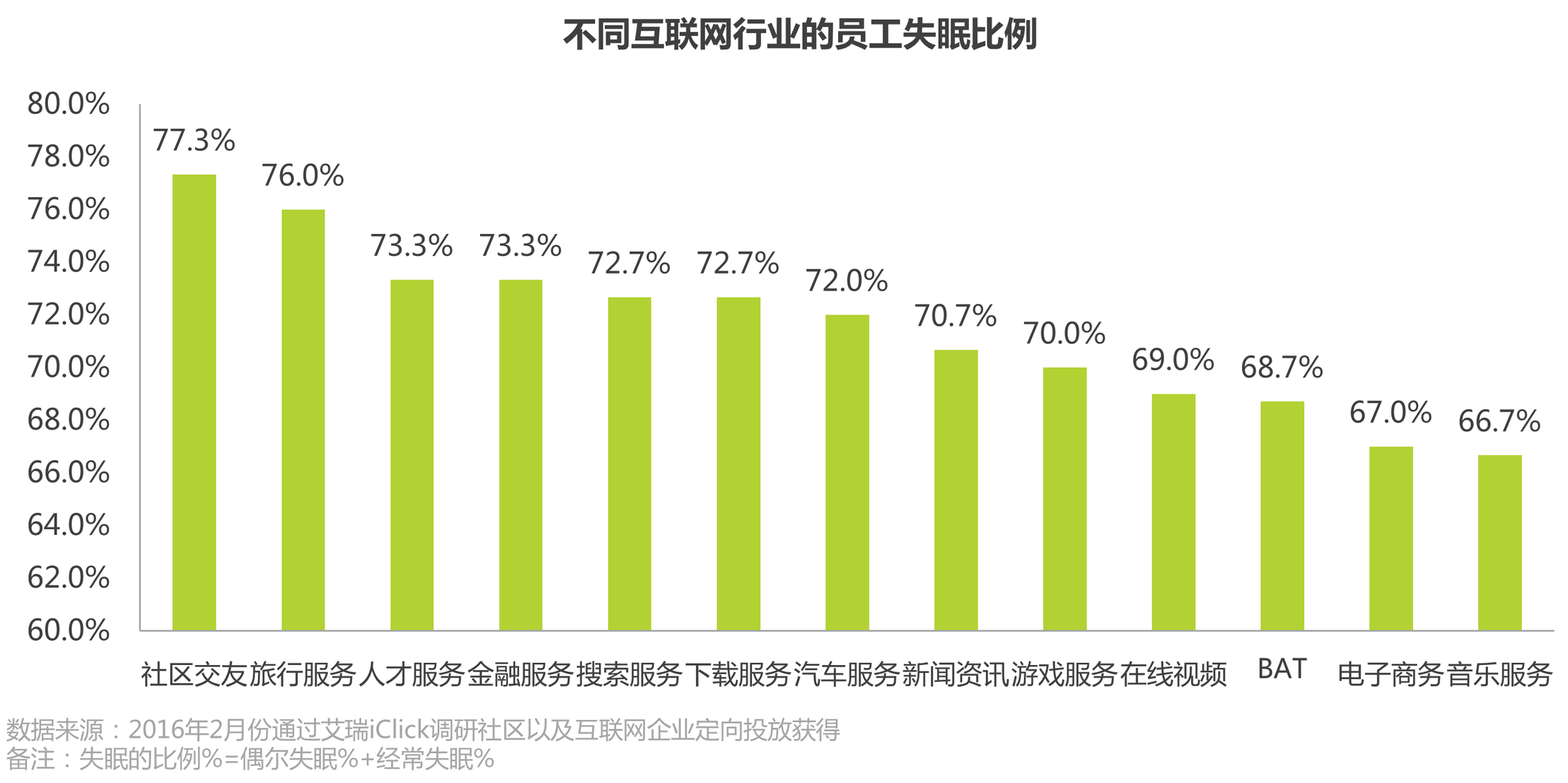 互联网员工的失眠现象较为普遍:社区交友、旅行服务、人才服务行业员工的睡眠比例高达77.3%、76%和73.3%。音乐服务和电子商务的失眠比例较低,分别为66.7%和67%。