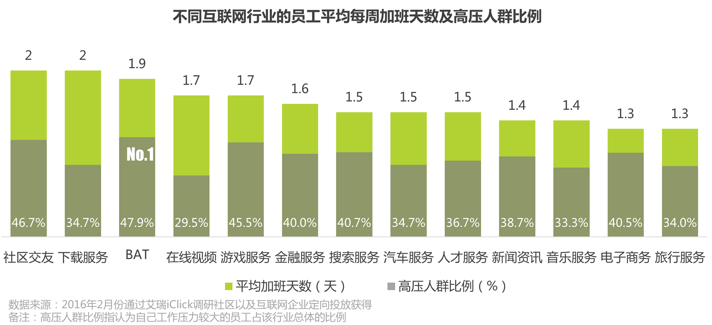 社区交友和下载服务员工的加班时间最多,而BAT压力最大