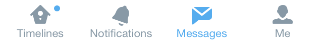 Twitter iOS版的底部菜单栏,消息视图是活跃的,用的是标志性的蓝。