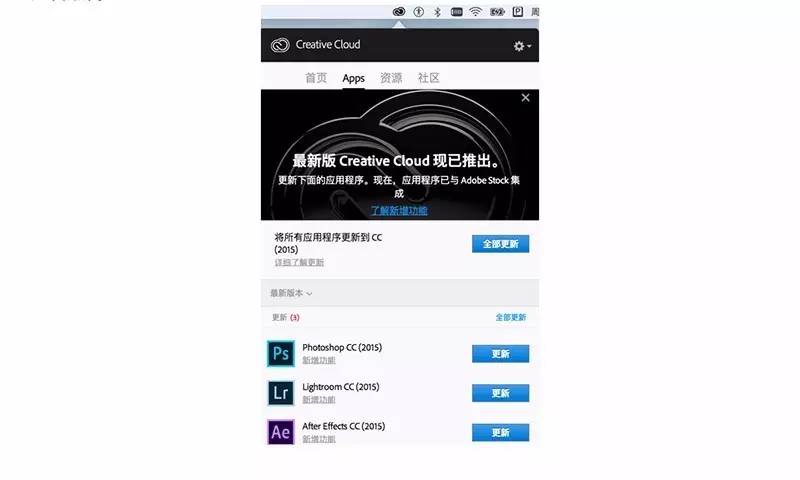 4、安装完成后,在顶部菜单栏的右侧,可以看到Creative Cloud图标,单击即可看到Adobe Creative Cloud的主界面,如下图所示。