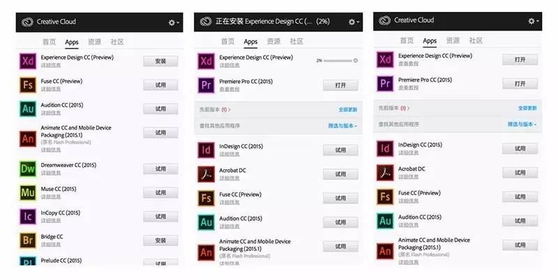 5、在Apps选项卡中,找到Experience Design CC(Preview),单击右侧的安装按钮,等待片刻即可完成安装。如下图所示。