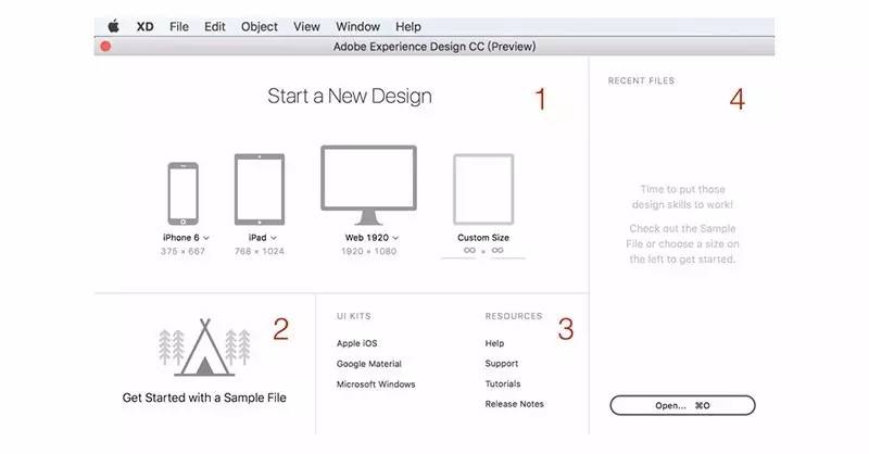 为了方便说明,我们单击界面2,打开范例文档,看到Xd主界面如下图所示。同样为了说明用数字进行标注。