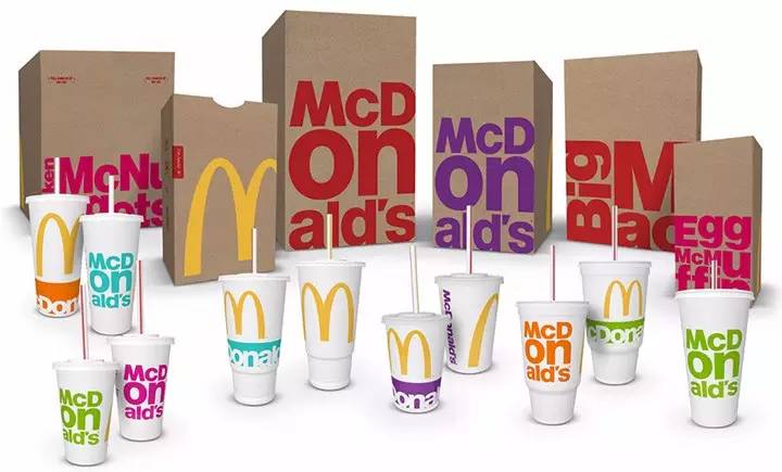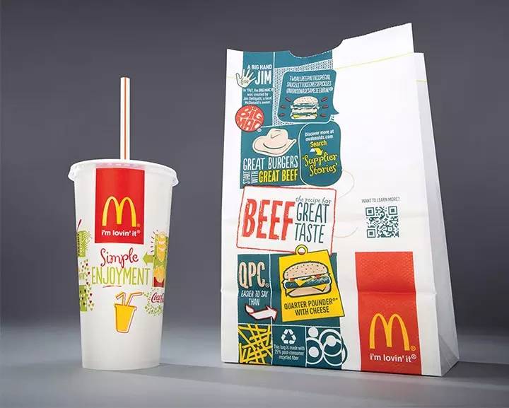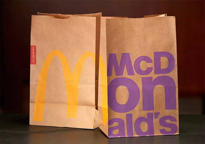 形成核心概念之后,麦当劳与位于芝加哥的公司Boxer Brand Design进行合作,再次对设计进行优化,并将其运用到各种包装上。包袋、杯子、盒子的中间都印上了明亮的粉色、草绿色、橘色、红色、天蓝色的标语:McDonald’s(麦当劳)、Big Mac(巨无霸)、Chicken McNuggets(麦乐鸡)、Fries(薯条)等等。包袋的边上则突出了M字母。五彩缤纷的颜色是想传递给读者:麦当劳是一个“五彩缤纷的品牌,”Biespiel说。从务实的角度来说,这些颜色与现有的生产棕色纸袋的供应链也很相配。麦当劳计划截至2020年之前,使用100%的再生纤维。使用棕色纸袋就是该计划中的一部分。