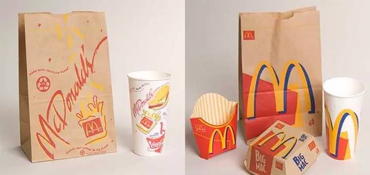 上一次麦当劳重新设计全球包装是在2013年。在那次的新包装上,二维码、标语、插图、以及图标被拼贴在一起。那时候的重点是运用图画来进行叙事。现在,麦当劳的包装运用极简风格,传递了公司的现代性以及进步性。简约的概念再次突出了麦当劳的核心品牌标志——文字图标、金色的M字以及菜单。