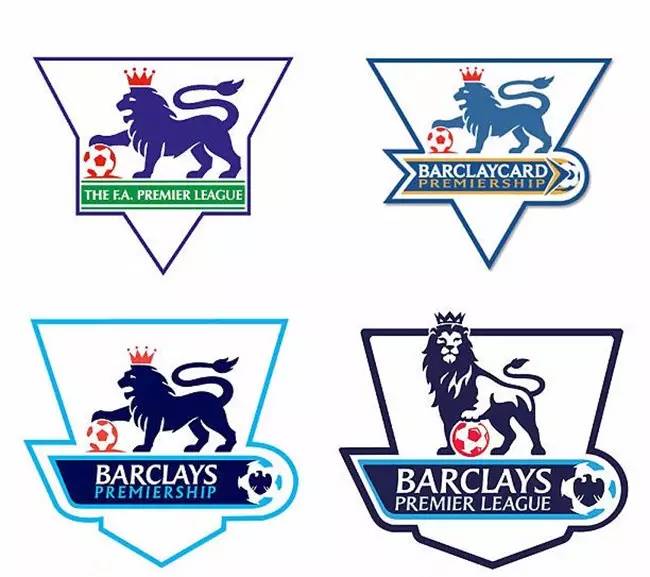 从上至下分别是 1992 年,2001 年,2004 年和 2007 年版本的英超联赛标志