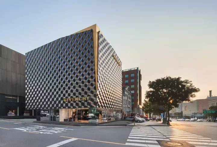 意大利MILAN建筑事务所的Piuarch建筑师同纪梵希艺术总监Riccardo Tisci合作设计了位于首尔的纪梵希旗舰店。项目是一个黑色盒子造型,由一系列模塑钢板组成,高楼层外立面形成波光粼粼的外形。该店坐落于首尔江南区核心区域的街角。纹路立面由波纹板构成,具有高度抛光感,会反射周边街道的光线。