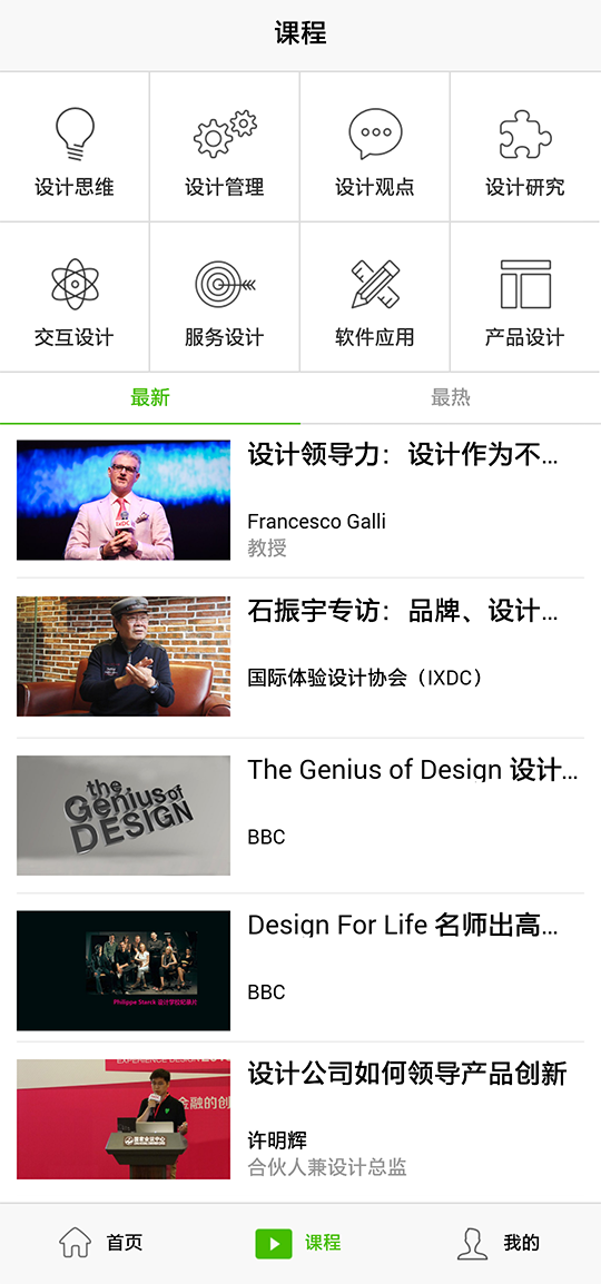 各领域特色课程应有尽有,TED演讲、软件实用类教学,BBC设计类纪录片等等,更有IXDC国际体验设计大会独家演讲,错过去年北京大会的你还等什么,赶紧进来聆听大牛们的精彩观点吧!