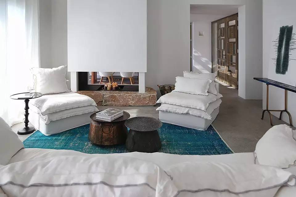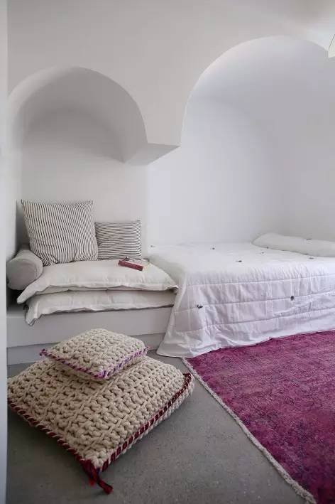 公共区域(客厅,厨房)与卧室划分明确,同时所有的房间都面朝海景。白灰泥墙、拱形天花,陶砖,不一不透露着地中海的气息。主要起居室中的壁炉让空间更为舒适。室外还含两个可做日光浴并带泳池的公共庭院。