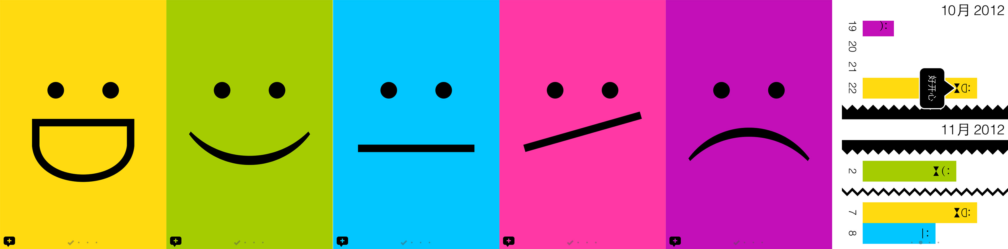 Moodoscope是一款标记心情的应用。当你选择心情标签时,都会得到一个与之对应的声音,在你迅速切换心情标签的过程中,这些简单的声音反馈就变成一首简单轻快的曲子。Moodoscope让我感到愉悦,也许我今天心情不是那么好,但是当我听到它悦耳的声音和可爱的界面风格,我的心情似乎都不再那么糟糕。甚至我争取让自己的心情好起来,给它一个靓丽美好的微笑。它给予用户积极向上的一个形象,在它面前我自己似乎都不好意思懊恼沮丧。