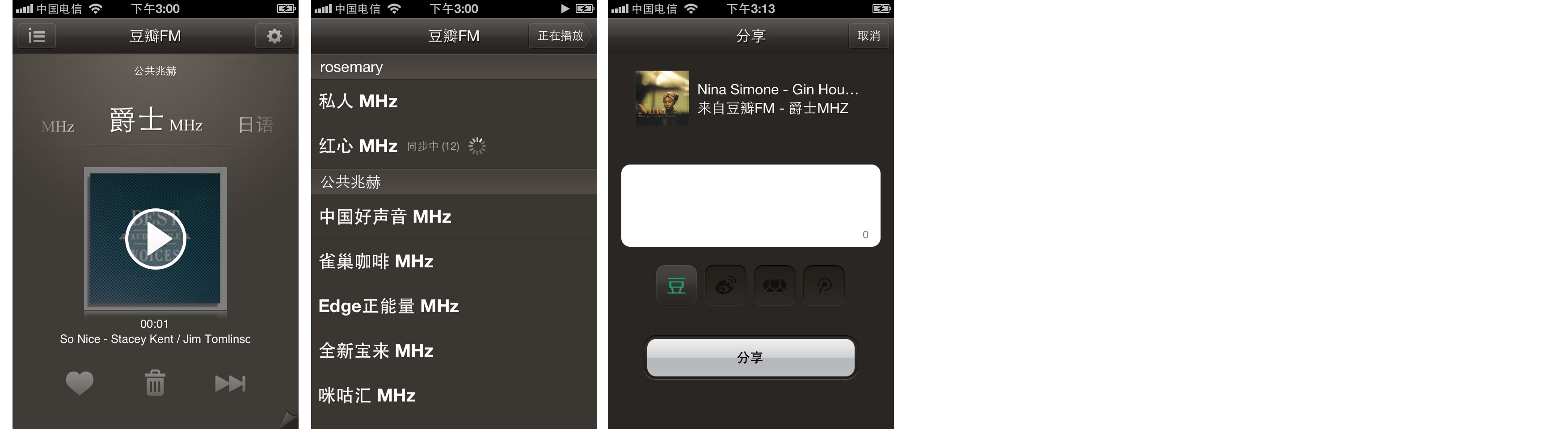豆瓣FM是我非常喜欢的一个应用,刚开始我甚至还没有意识到自己喜欢它,偶然一天发现自己使用了它之后就没有再去使用其他的音乐播放器。我对它没有什么不满,相反它常常给我一些惊喜,播放一些过去我很喜欢但已经很久没有听到的歌曲,这种熟悉感,像瞬间转换时空回到了大学宿舍晚上的广播时间。它足够简单,界面交互简单朴实,不需要多余的操作,就可以开始音乐之旅。更重要的是它偶尔能让我的心境又会回到某年的某个瞬间。