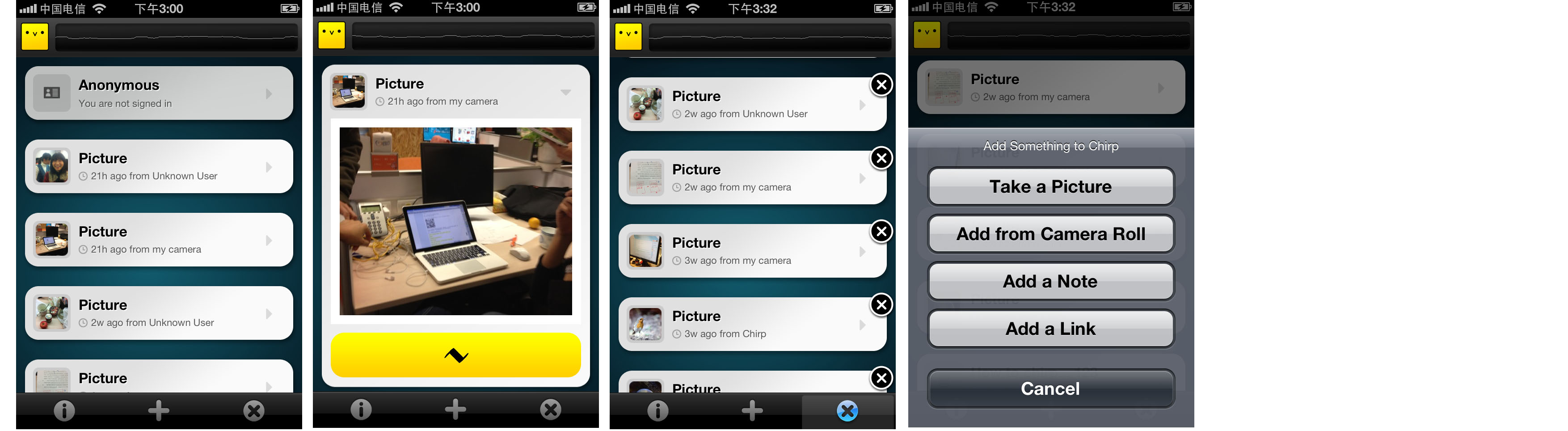 Chirp可以将拍的照片转换成音频,几个人同时打开Chirp后,其中一个人点击图片播放该图片形成的音频,其他人的chirp界面就会收到这张图片。它利用了生成的音频进行图片传送,功能诚实单纯。可能很多人知道可以通过对声音的解码去传递信息,但是却没有Chirp这么简单。