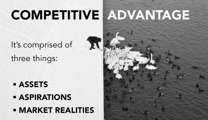 但竞争优势是由什么构成的呢?有三个方面:资产、抱负、市场现实。