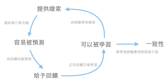 这五个设计原则会形成一个完整的操作生命周期,当使用者发现介面上提供的线索,就会开始尝试与介面产生互动。如果他能够预测每个能互动的元件所造成的结果,他就会试着按下按钮或选择项目,系统则提供足够的回馈给予使用者,印证他们的假设没有问题。这叁个步骤如果都按照使用者的预期发生,那麼他就会将这个操作流程与结果学习起来成為经验。下次如果看到与此介面一致的系统时,就可以透过这次的经验让他更快上手。