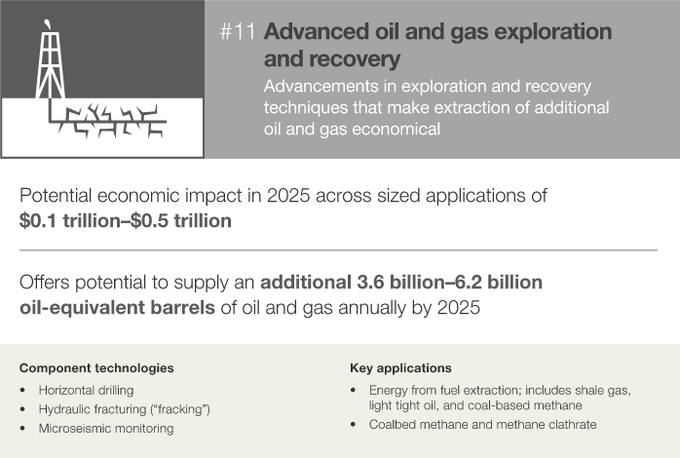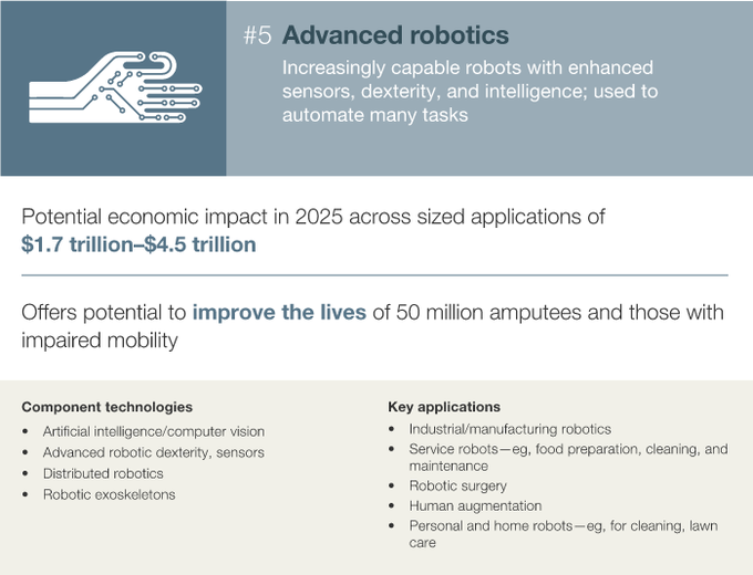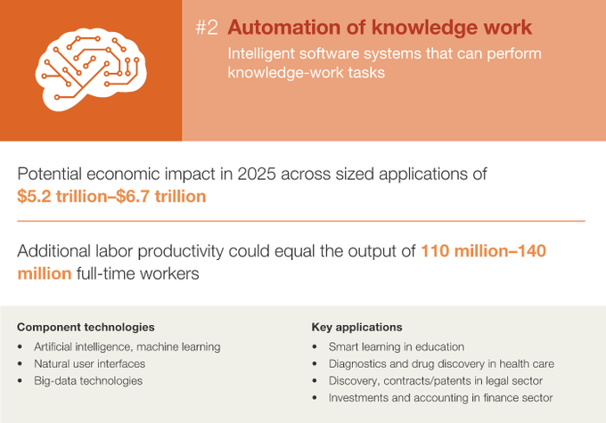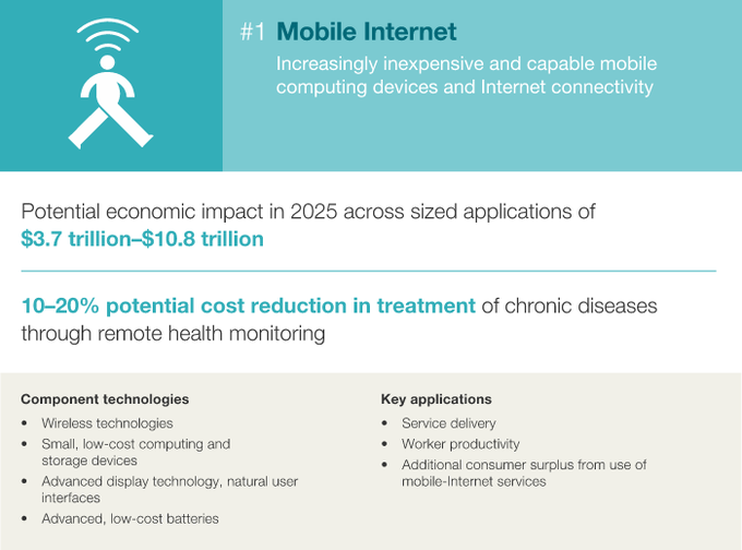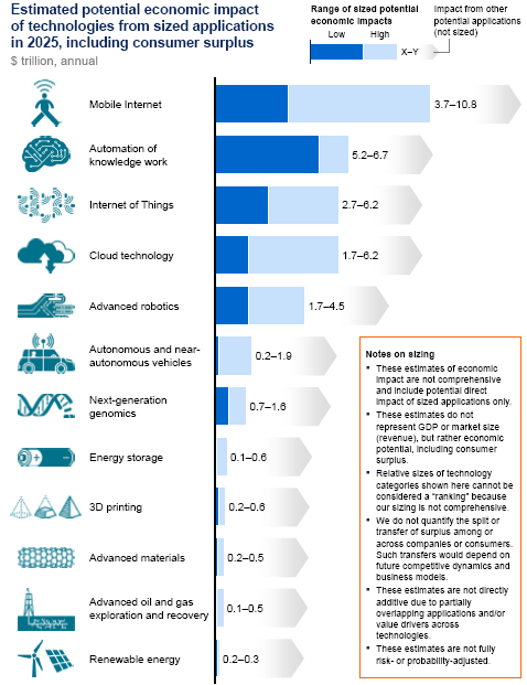 以上就是麦肯锡列举的颠覆性技术及其潜在的经济影响程度(含消费者盈余在内,即消费者并未支付的因创新而获得的价值),当然,这种影响评估只是粗略的,不会像 GDP 数字那么具体。