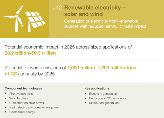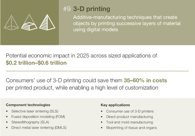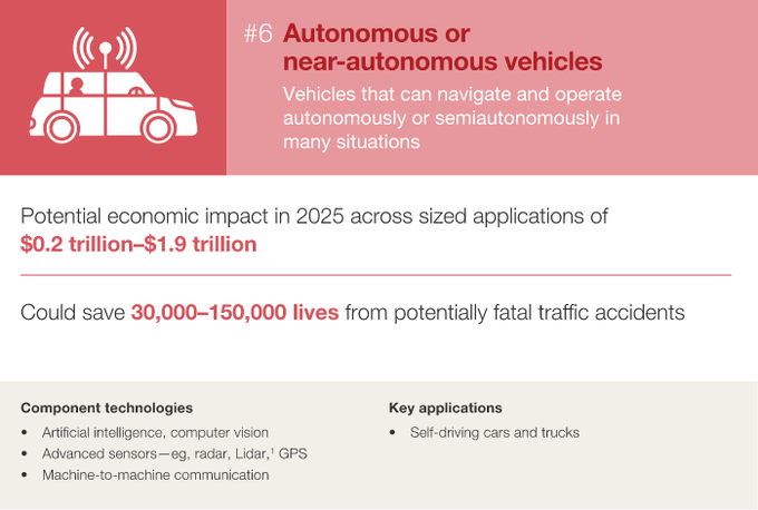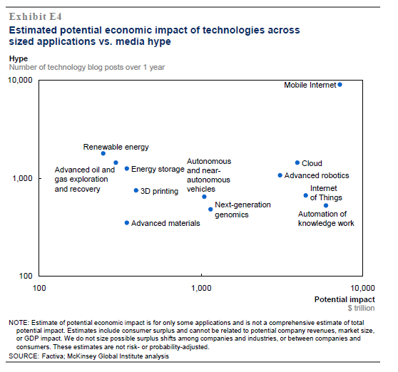 不过麦肯锡的报告中令人感兴趣的预测是,一些比较性感的新潮技术,如无人驾驶汽车、3D 打印、可再生能源等的经济影响相对较低。