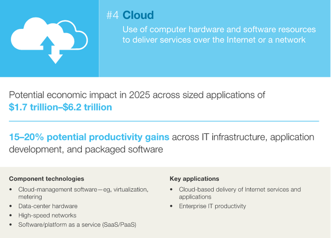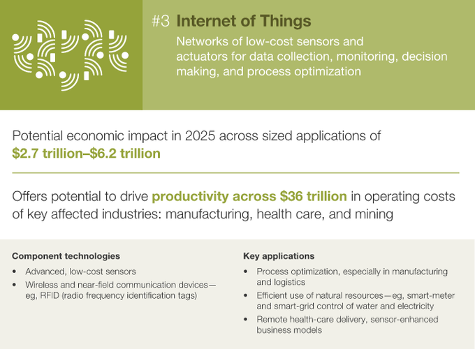 如上表所示,麦肯锡认为,未来 10 多年最具经济影响性的技术应该是那些已经取得良好进展的技术—如已经在发达国家普及并在新兴国家蓬勃发展的移动互联网;知识工作的自动化,比方说用计算机语音来处理大部分的客户电话;物联网,比方说将传感器嵌入物理实体中用来监控产品在工厂的流动;以及云计算。按照麦肯锡的估算,到 2025 年,这些技术每一个对全球经济的价值贡献均超过 1 万亿美元(即便是预测的下限)。