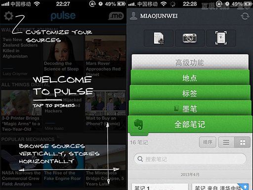 iOS 模式的 Bottom Bar,在绝大部分应用中被用作导航栏,但是由于屏宽限制,在数量上并不能完全满足需求,不少应用发展出了其他的方式。刚开始大家都将导航栏隐藏在页面左边,只需要点击左上方的某个按钮就能打开导航,随后更方便的方法被设计出来,手指向右滑动手势,更直观高效地实现了这个需求。此外,值得一提的是,Evernote 延伸了卡片式界面设计,上下滑动手势让导航栏呈现除了别样的风格。