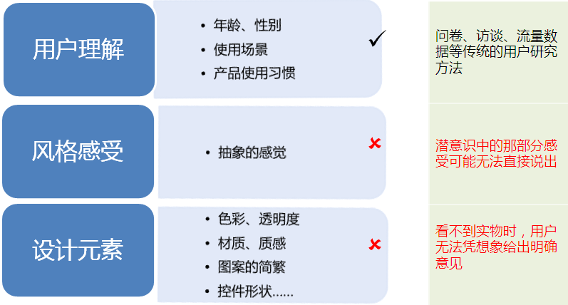 虽然传统用户研究方法对于“了解用户”有些帮助,但似乎对“直接指导视觉设计”无能为力。