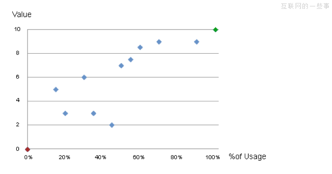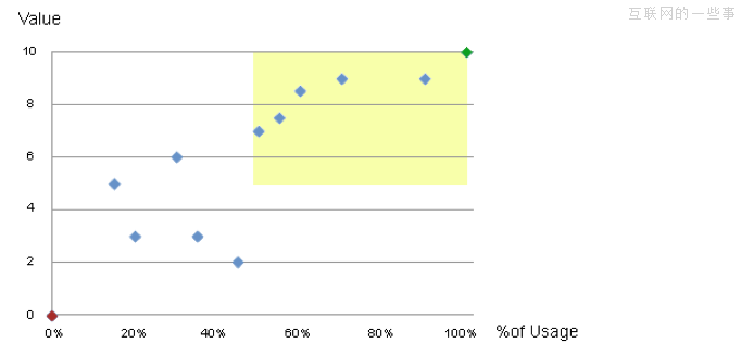 一旦你在怀疑清单对所有的功能都评级以后,下一步,就是建立一个图表,把这些功能使用比例和价值评级画在图上。