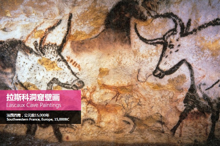(图示)如果大家对艺术史很熟悉,这就是法国西南部发现的拉斯科洞窟壁画,距今已经15000年。大家可以看到这样一种非常好看、但受限于当时的技术,只能做这样的设计。