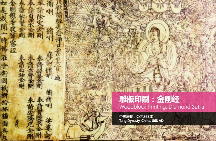 (图示)这个是一个艺术品雕版印刷的《金刚经》,是中国唐朝——公元868年的时候。一直到唐朝的时候,技术才有所突破,才出现了现在看起来非常漂亮的《金刚经》的艺术。