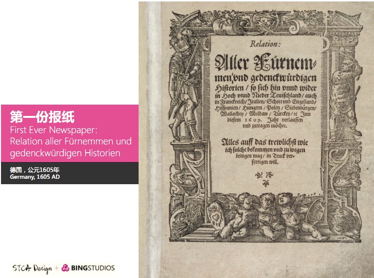 (图示)这是每个人都知道的活字印刷,中国的毕昇发生了活字印刷。中国人非常自豪发明了活字印刷,但是,对西方人来说有不同的见解。他们承认是中国人最先发明了活字印刷,但他们更推崇的是约翰内斯·谷登堡发明的西方活字印刷,他没有参考中国,而他的发明知识普及到了各个阶层和层面。现在大家看到的实际上是一个铜版画的画像,这个技术也在当时被发明。版画的技术在当时发明,他们的工作环境大概是这样的。如果各位早出生几百年,这就是各位几百年前的样子。有了印刷的技术,然后也有了版画的技术,第一份报纸就应运而生。