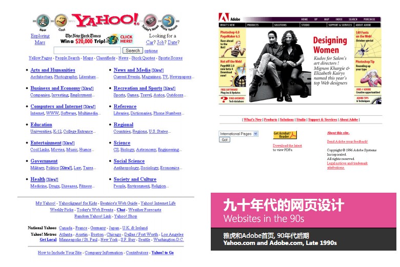 (图示)这是当时90年代的一些网页设计,跟现代不可比拟,但在当时的情况下设计师也根据已有的技术提出了很多新的想法,比如说所有的图像都被切割出来到每个页面去。
