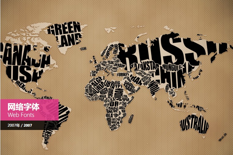 到了2007年年,网络字体应运而生,网络字体在印刷里面想用什么字体就用什么字体,但是在网页设计上面挑战非常大,中文就是可以确定的宋体、黑体两种字体,英文可能稍微多一点,大概也不超过十个,设计师非常烦燥:为什么我们在网络设计上就不可以做到这一点?由于设计师推动网络字体的技术应运而生,中文字体好像还没有网络字体的技术,我不是很清楚,希望在近几年看到中文网络字体的发展。