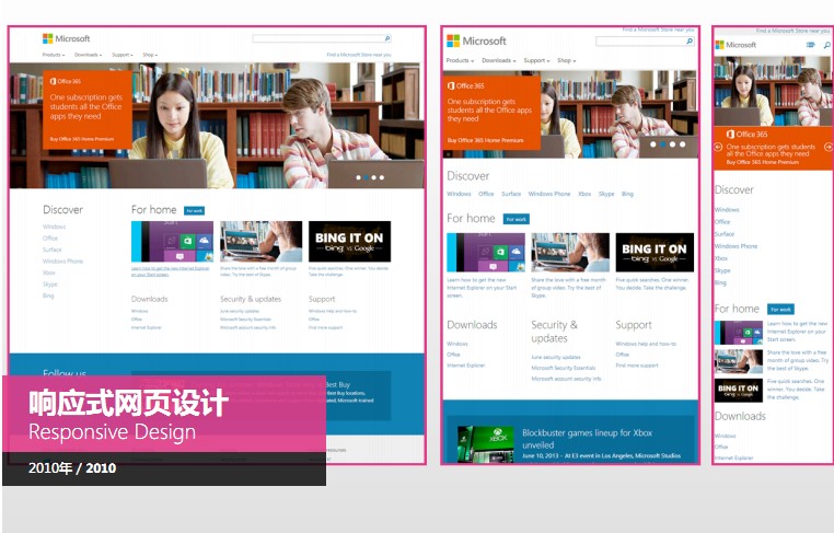 近年来,炒得非常火热的“响应式网页设计”,因为设计师感觉到不同的浏览器和大小上面要有不同的呈现。渐进式设计增强,我不知道中文怎么翻译,我自己翻译的是“渐进式设计增强”,我用各种设备,各种浏览器,有大有小,有的浏览器可能是老的版本不支持一些新的技术,当时设计师和开发人员经常要用很多方法和技术确保一个网页或者是一个界面在不同的设备上面、不同的浏览器显示得一模一样,这就造成了很大的问题。这样一个渐进式的设计增强就是像电视一样,有黑白电视,有高清的电视,但节目显示是内容的,内容虽然是一样的,显示形态不同,就是说根据浏览器和设备不同显示同样的内容,但是不同的表现方式,这是近几年炒得非常火热的设计师提出的概念。