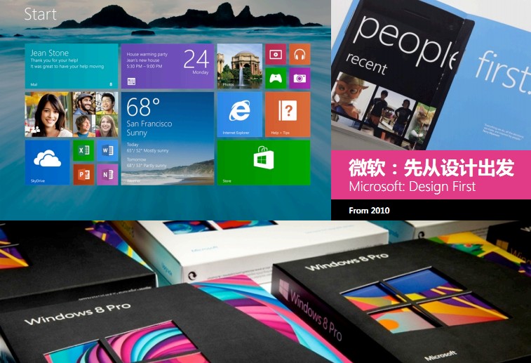 因为我是微软的,需要做一些自己的宣传。微软之前不是一个以设计为重心的公司,就是以技术为主——这是肯定的。但是,在设计可以引领科技的这几年发展潮流当中,我们的设计师不干了!所以2010年2月份的时候,来自世界各地的设计师一起探讨如何引领科技,大家也知道微软最开始宣传了以人为本,扁平化设计也是在Windows上面实现的,接下来给大家看一个视频,就是在那次会议之后整个理念的转变。(视频播放)这个是一个从整个大的公司范围内我们对公司的产品以设计先行,引导科技的案例。