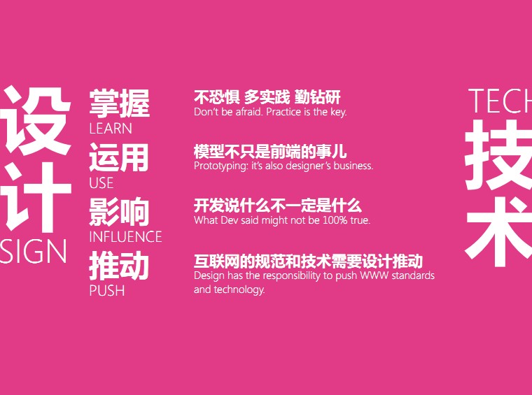 最后我想跟大家再分享一下,我觉得大家在这儿都是设计人员。我自己感觉,设计师应该不惧怕技术,设计师面对技术的时候应该做到:掌握、运用、影响、推动。