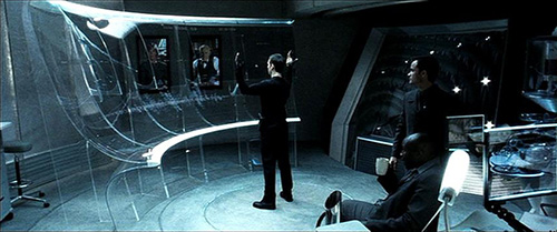 科幻电影中最吸引注意力的界面基本都是用手势操作的。电影《少数派报告》(Minority Report)中预防犯罪小组的警察使用的界面就是如此。约翰·安德顿侦探通过此界面看到三个“先知”的预测画面。当出现未来可能发生的犯罪场景时,安德顿就会到事发地点阻止犯罪,并逮捕潜在犯罪者。