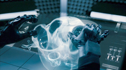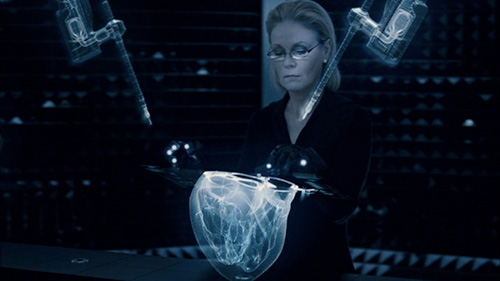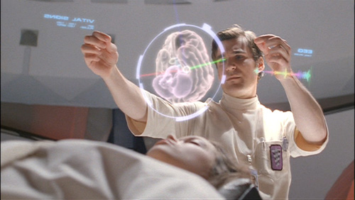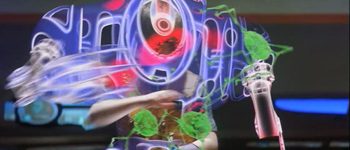 大部分手势操作设备只提供给用户一个可交互的界面(看不到其他硬件),但在《少数者报告》中需要用户带上一种指尖发光的手套,如上给虫蛹做远程手术的图片。我们可以想象成这是对可视方面的需求,这种方式确实方便电脑追踪手指的确切位置。
