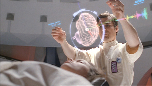 在虚拟界面中旋转物体和在现实世界中旋转物体有些类似。双手拿住物体的不同边,沿着轴线向顺时针或逆时针方向移动,虚拟物品就会旋转。美剧《萤火虫》中Simon Tam博士用这样的手势来控制界面检测他妹妹的大脑。(下图)