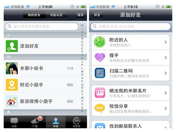 对于一个社交即时通讯产品,添加好友的功能是好友汇聚的来源,虽然米聊微信都绑定手机通讯录,但话又说回来,用户找手机通讯录联系人语音聊天的还是比较少。添加好友是引导用户去发现好友、找好友、碰好友的一扇门。所以对于这么重要的功能放置在应用程序的哪个位置,在产品前期就会让用户明显地去选择用哪个应用,因为聊天工具的前提是要有人和你聊天。再回到现实的界面中来,看看下面的对比: ![]()
