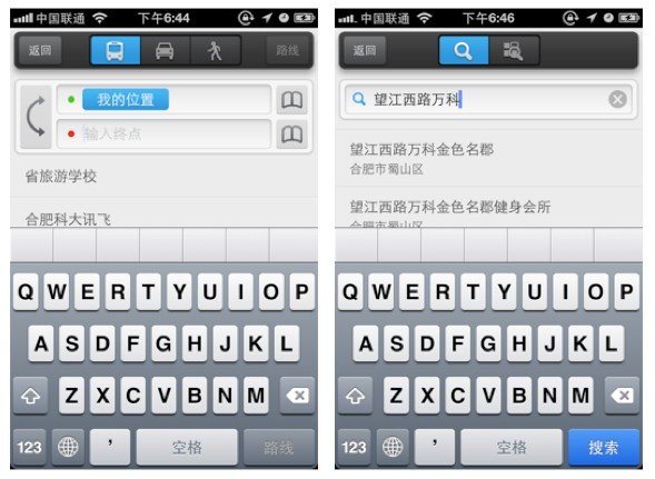 百度地图也是用得比较顺手的一个地图导航应用,在减少输入方面也做的比较出色,百度地图拥有cookies功能, 另外就是百度搜索的技术应用在地名的匹配中也很让人欣喜,在用户输入到一半的时候,下面的候选列表就出现了目标地址,用户直接停止输入点击列表即可。