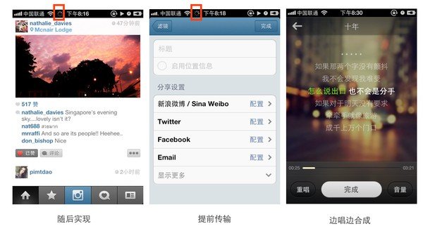 案例2:提前传输。 Instagram中发布帖子的时候,用户处理完照片点击“上传”按钮就看到中间的界面,这时候界面是让用户去为自己的帖子输入一个主题,或者去设置分享等功能,同时我们可以看到红色框中的“菊花瓣”,很明显后台已经开始传输刚才上传的照片了,所以当用户在点击“完成”时,数据只需要上传剩下的一部分,让用户感知上传很迅速;