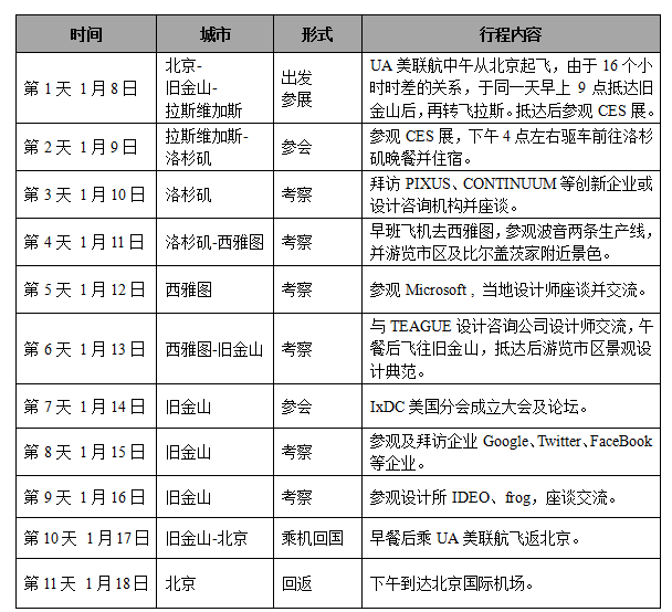 此次考察将组织参观2014年美国CES消费电子展,拜访知名互联网企业与创新设计机构,实地感受国际巨头企业的成长经历,学习产品创新与体验设计专业方法,对接优势资源与平台,落实潜在合作商机。活动将安排拜访Google、FaceBook、Twitter、Microsoft、Pixar、IDEO、frog等全球互联网和设计企业。同时,为加强与国际交流和战略合作,完善与拓展IxDC组织机构,特在此次访美期间举办“IxDC美国分会”成立大会,主持成立仪式与交流论坛。