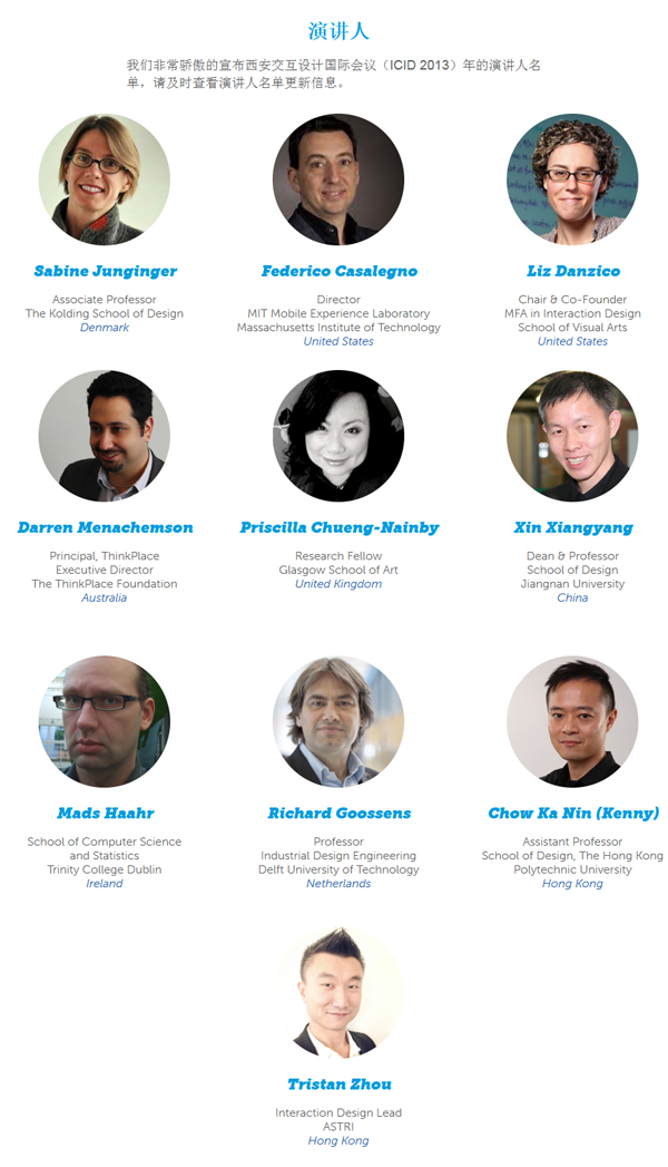 更有10余名境外专家,分别有:Liz Danzico(美国纽约视觉艺术学院,主席)、Federico Casalegno(美国麻省理工学院,移动体验实验室主任)、Sabine Junginger(丹麦设计文化与管理研究中心,副教授)、Darren Menachemson(澳大利亚ThinkPlace策略设计咨询公司,执行长)、R.H.M. Goossens(荷兰代尔夫特工业大学,教授)、Mads Haahr(爱尔兰都柏林三一学院,博士)、Priscilla Chueng-Nainby(英国格拉斯哥艺术大学设计创新研究院设计研究主导员、博导,爱丁堡大学数码媒体设计硕士生导师)、Chow Ka Nin (Kenny)(香港理工大学,助理教授)、Tristan(香港创新设计中心,交互体验顾问)等。