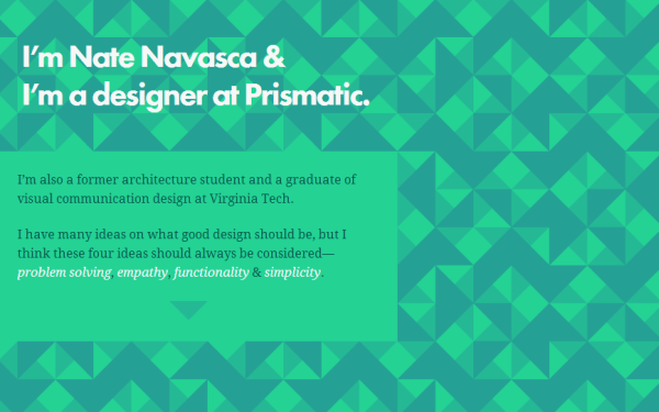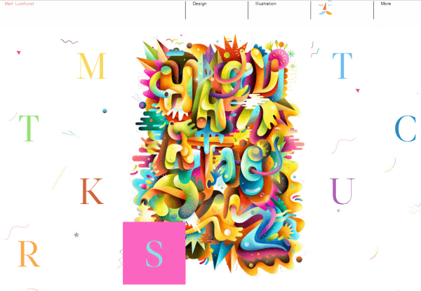 这个网页色彩斑斓也很有趣。首先映入眼帘的是活泼的衬线字母,接下来, 看起来很随意分散的字母拼写出Matt的名字。悬停效果显示每个项目的示例图片,这种做法非常有效,几乎是跳出字母的限制。这个网站显示了字体可以作为平面元素合并在设计中。混合在一起的五彩有衬线字母打破了经典,可能我们能够从衬线字体中更清醒的找到创意。