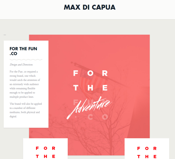 这个网站的字体很漂亮。这也是设计的一部分,同时也给访问者建立了一个对这个设计师的作品的心理预期。“Hi there”非常的巨大,抓住了用户的注意力。其他的装饰性的马戏团式字体非常吸引人眼球也很有趣。你不会每天看到这些,它作为一种介绍是非常的有效。剩下的整个网站的感觉有一点点位置不合适,尤其是在空间和对比度上。