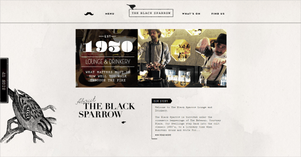 这个网站看起来显得有点复古,大量的字体都使这个网站显得折中主义,有一种很淳朴的感觉。这个小酒吧休闲室的主题是基于Chaeles Bukowski的小说,结合一些文学的元素和古老的打字机字体的标志。我喜欢它的导航条,当你的鼠标悬停在上面的时候,那些小图标转动的方式。这个网站真有一种20世纪三十年代的感觉,那些麻雀的插图让这种感觉更加强烈。然而,在空间允许的情况下,字号有一点偏小而不太容易阅读。