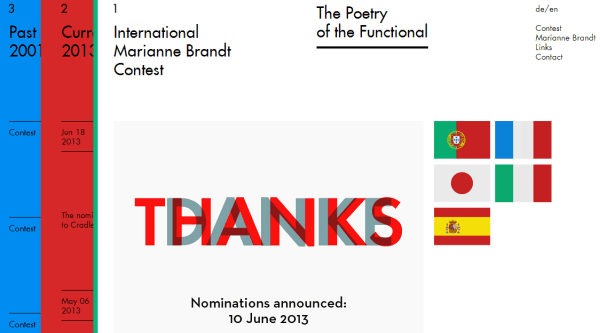 捕获我的注意力的是“thanks/Danke(谢谢的英文和德文)”这块。你设定了哪种语言决定了哪种“感谢”显示为红色。这是一个很棒的创意对于那些支持多种语言的网站。不同的选择提醒我不同区域的不同色块,这是以一种很好的方式去将网站的信息进行分类。颜色,几何造型,以及整个字体都全部是包豪斯主义。