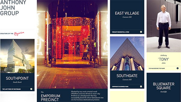 Anthony John Group使用方块来展示他们创作的各个项目,还有关键的公司信息,比如“幕后团队”。主页的规划与构建很棒,但也结合紧密。很明显,他们致力于创造像这个页面一样优雅的高端建筑设计,如果没有这些方块,可达不到这样的效果。