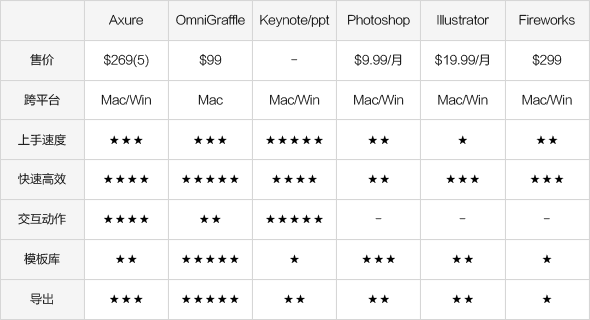 在实际使用过程中,由于项目具体阶段、平台特性以及输出物展示对象的不同,并没有哪个工具受到设计师们一致认可,每个都有其各自的优势和缺陷,按照个人经验对比了一下常见的几款。