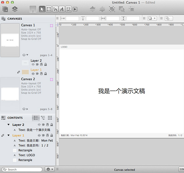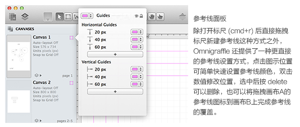 和 Fireworks 一样,Omnigraffle 提供类似的画布和图层管理,方便将项目所有内容集中在一个文件中,每个画布可以单独设置页面背景、大小、单位、网格和参考线,并且可以通过共享图层让所有画布使用同一个母版,也就是说既可以当 Indesign 用,也可以当 PPT 用。